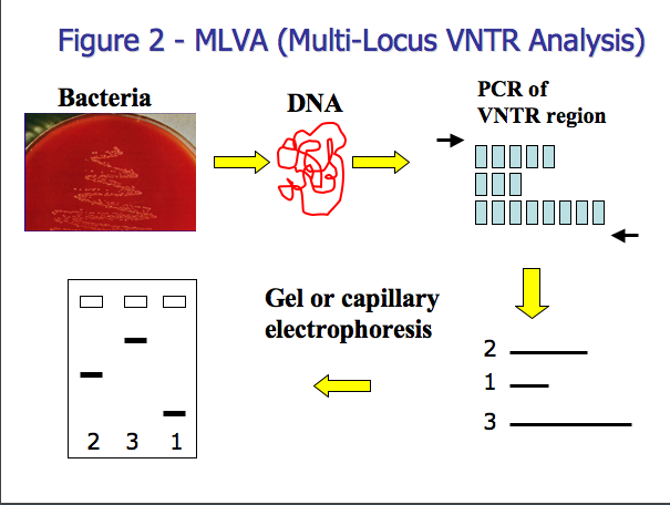 The first step of PFGE is to make a suspension of bacteria and buffer (Figure 1-step 1). Molten agarose is added to the bacterial suspension and the agarose/suspension mixture is added to a mold (Figure 1-step 2). The agarose is allowed to solidify then added to a lysis solution which breaks open the bacteria releasing the DNA. Subsequent washing steps remove extracellular debris leaving intact, circular genomic DNA in the agarose plug (Figure 1-step 3). A small piece of the plug is cut off and added to a restriction endonuclease mixture which cleaves DNA at a specific sequence (Figure 1-step 4) resulting in 10-20 DNA fragments of varying sizes. The large DNA fragments are then separated by size by pulsed-field gel electrophoresis (PFGE) (Figure 1-step 5). PFGE facilitates the migration of the large DNA fragments through the agarose gel by regularly changing the direction of the electrical field during electrophoresis, allowing the fragments to maneuver through the agarose. The smaller DNA fragments will move faster through the agarose than the larger fragments and the result is a pattern of DNA fragments (also called bands). The pattern from one isolate can be compared to other patterns to determine whether the samples may have originated from a common source. PFGE Advantages -Easily applied to different species -Patterns consistent within and between laboratories (strict adherence to standard conditions is necessary) -PFGE generally yields a high amount of pattern diversity PFGE Drawbacks -Labor-intensive -Relatively slow (approximately 24 hours to completion) -Complex patterns challenging for inter-laboratory pattern comparisons -One mutation can yield differences in several fragments (PFGE cannot determine phylogenic relationships) -Dependant on isolated bacteria Multiple-Locus Variable Number Tandem Repeat Analysis (MLVA) Multiple-locus variable number tandem repeat analysis (MLVA) is a subtyping method that utilizes short, repetitive regions of DNA called variable-number tandem repeats (VNTR) which may be present in different numbers of repeats between strains. These variable number tandem-repeat (VNTR) regions have been identified in many species of bacteria. Multiple VNTR regions can be analyzed in one typing method (MLVA) to differentiate bacteria within a species. Most VNTR regions used in MLVA are small, containing between 3 and 21 base pair repeats.