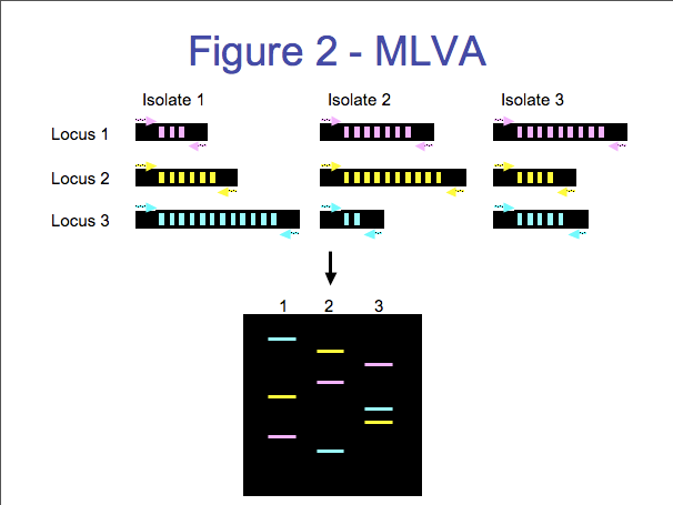 There are several steps involved in MLVA (Figure 2). The first step involves amplifying the VNTR using polymerase chain reaction (PCR is a common method used in molecular biology to amplify a specific region). PCR is used to amplify the conserved DNA outside the VNTR in addition to the variable VNTR region. The fragment size is dependant on the number of repeats for a sample. The size of the resulting fragment is determined by either horizontal or capillary electrophoresis (2). Horizontal electrophoresis uses traditional agarose gels to estimate the size of DNA fragments while capillary electrophoresis uses a DNA sequencer for fragment size analysis. Capillary electrophoresis is a particularly attractive option because you can attain extremely precise measurement of the fragments’ size (often within one base pair), which is ideal for large databases and inter-laboratory comparison.