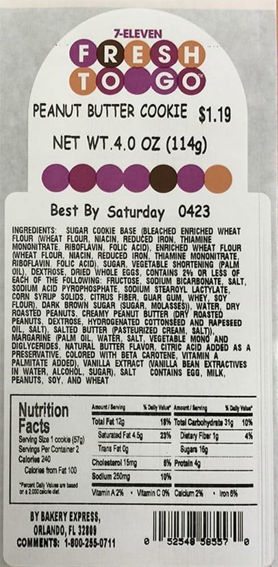 In the third recall this week of 7-Eleven FRESH TO GO cookies for undeclared peanuts, Orlando-based Bakery Express of Central FL Inc. announced today that it is recalling some two-cookie packages distributed to 7-Eleven convenience stores in Florida. People who have an allergy or severe sensitivity to peanuts run the risk of serious or life-threatening allergic reaction if they consume these products, this latest recall stated. Earlier this week similar cookies were recalled in New York and California. The affected cookies are packed in a clear package film, two cookies per package, labeled “Fresh To Go” and have “best buy” date codes Friday, 04/22/16, Saturday, 04/23/16, Sunday, 04/24/16 on the front label, the company stated. These recalled products are as follows: 7-Eleven Fresh To Go Sugar Cookie made with M&M chocolate candy, UPC: 052548558765