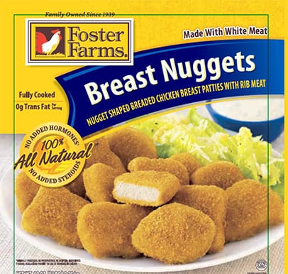 - 5-pound bags containing Foster Farms “Breast Nuggets – Nugget Shaped Breaded Chicken Breast Patties with Rib Meat.” The recalled bags have best by dates of 2/21/17 and 3/8/17.