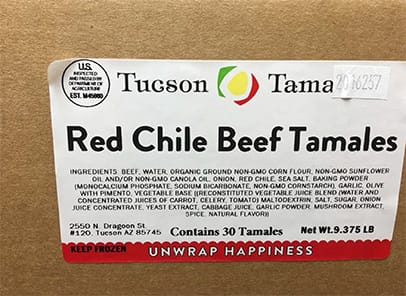 - Bulk boxes containing 10- or 11-oz packages of two “Tucson Tamale Red Chile Beef Tamales,” with packaging dates of 8/11/2016, 8/15/2016, 8/22/2016, 8/31/2016 and 9/13/2016, and with case and package codes 2016224, 2016228, 2016235, 2016244 and 2016257.