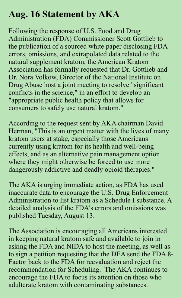 On July 3 the Food and Drug Administration released a statement about its investigation into kratom products in general. An advocacy group, the American Kratom Association, has been increasingly critical of the FDA’s position on kratom. The group issued a news release Aug. 16 requesting a meeting with FDA Commissioner Scott Gottlieb.