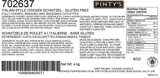 The second recall, posted yesterday, affects Pinty’s brand “Italian Style Chicken Schnitzel” sold in 4-kilogram packages. It has a UPC number of 10069094626371. Pinty’s distributed the schnitzel, also referred to as chicken cutlettes in the recall notice, to retailers nationwide in Canada. The schnitzen recall was triggered by CFIA test results related to its investigation of the Listeria found in the chicken strips.