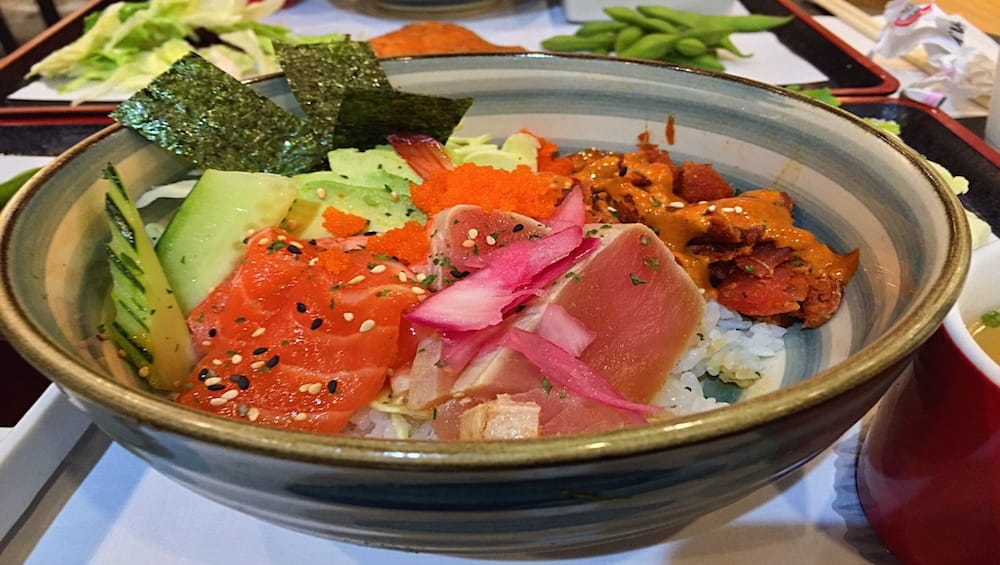 A Chirashi (means scattered) is a big bowl of rice mixed with your choice of fish, vegetables, and other ingredients.