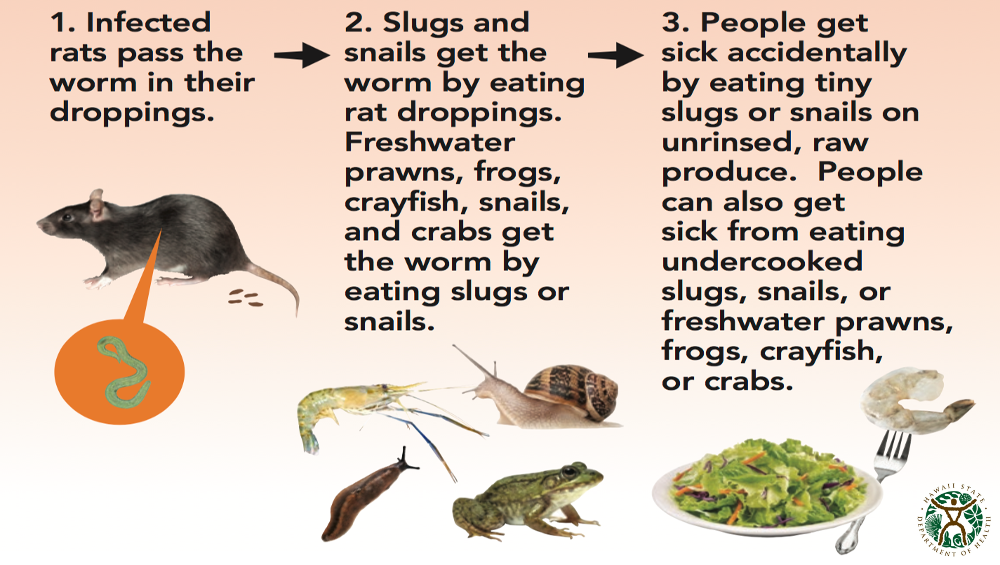 In Hawaii, public health officials have said host animals, particularly snails, are frequently found in fresh lettuce and other salad ingredients that are served raw.