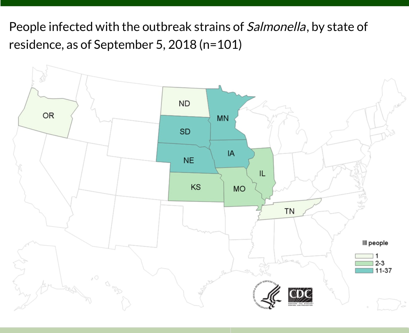 The most recent person to be infected with the outbreak strain of Salmonella became ill on Aug. 7, according to the final outbreak report posted Wednesday afternoon by the Centers for Disease Control and Prevention. That person brought the number of confirmed infections to 101. Sick people are spread across 10 states.