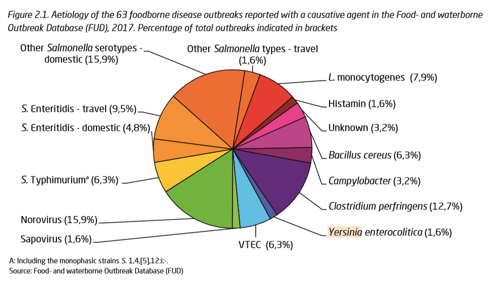 Yersinia enterocolitica infected 80 children, four confirmed, with a link to improper heating or possible cross contamination of pork meat served as part of a dinner.