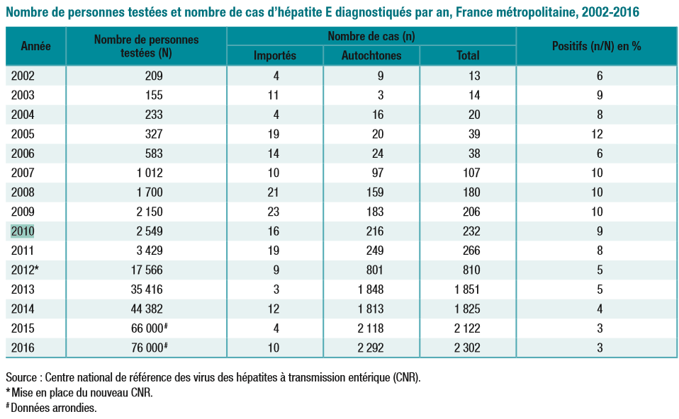 In France, hepatitis E surveillance has been done by the National Reference Center (CNR) for enteric-transmitted hepatitis viruses (hepatitis A and E) since 2002.