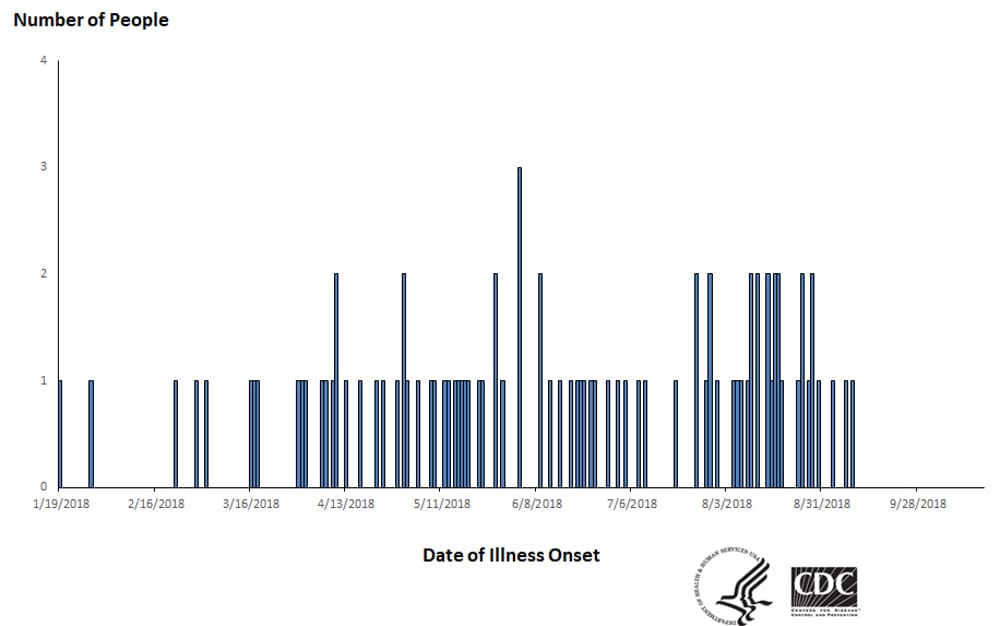 The people with confirmed infections are spread across 29 states, according to an investigation announcement posted by the Centers for Disease Control and Prevention. The patients range in age from less than 1 year old to 105 years old. Of those with information available, a third have required hospitalization.