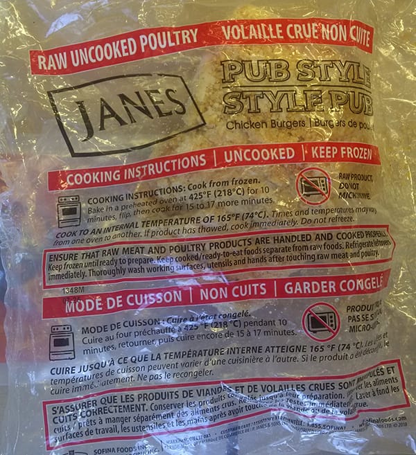 Sofina Foods Inc. is recalling Janes brand Pub Style Chicken Burgers from the marketplace because of a risk of possible Salmonella contamination.