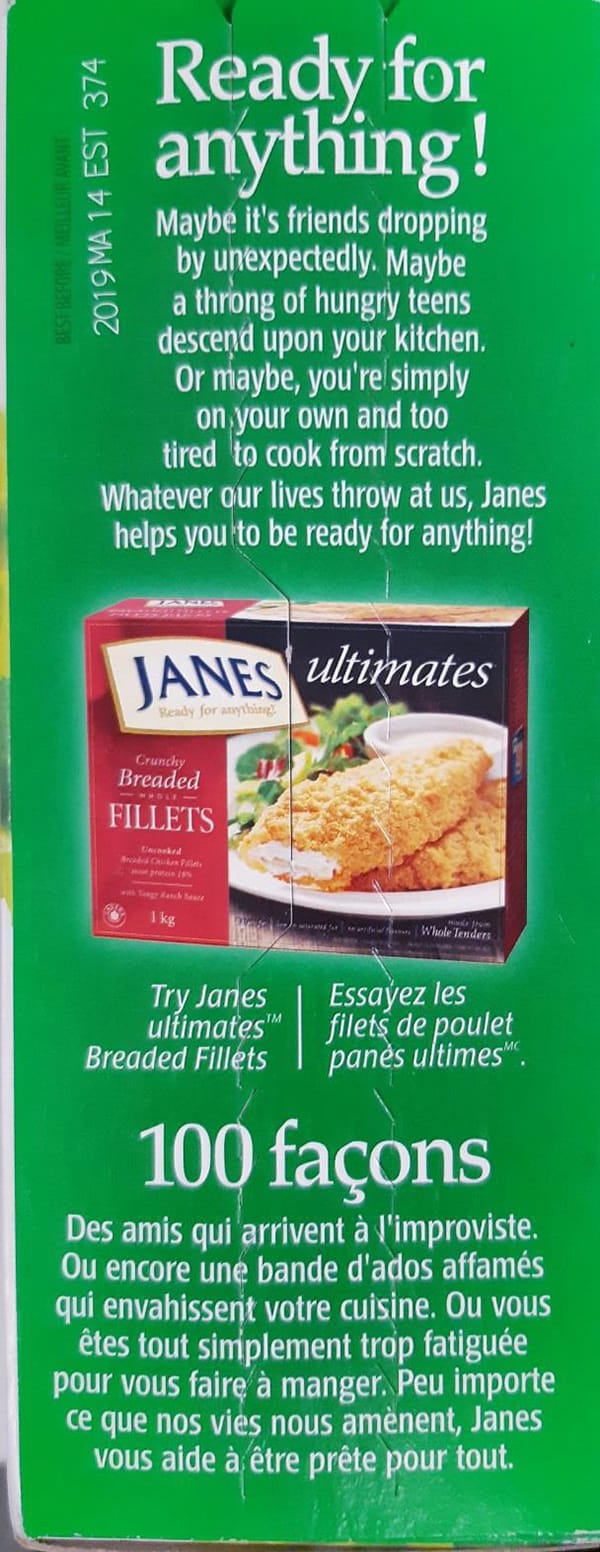 | Janes | Pub Style Chicken Burgers – Uncooked Breaded Chicken Burgers | 800 g | Outer package: 2019 MA 14Inner package: 1348M |