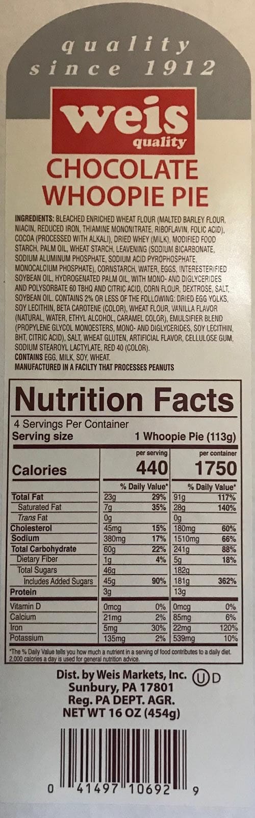 The recalled “Chocolate Whoopie Pie” products were packaged in 16-ounce, clear plastic packages, and are marked with a wrap around “Weis” Label with a UPC of 4149710692.