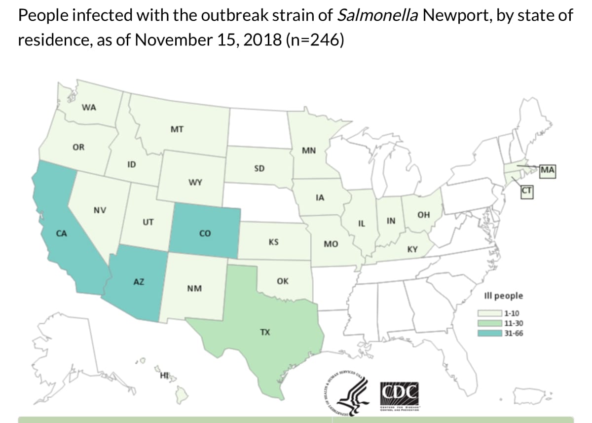 According to CDC, whole genome sequencing analysis did not identify predicted antibiotic resistance in 180 Salmonella bacteria isolates from 176 ill people and four food samples. Testing of seven outbreak isolates using standard antibiotic susceptibility testing by CDC’s National Antimicrobial Resistance Monitoring System (NARMS) laboratory confirmed these results.