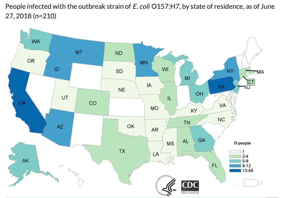 The E. coli O157:H7 outbreak this spring sickened 210 people across 36 states, hospitalizing 96 patients. Five people died, according to the Centers for Disease Control and Prevention. Of the laboratory-confirmed patients, 27 developed a type of kidney failure known as hemolytic uremic syndrome (HUS). It was the largest E. coli outbreak in the United States since the 2006 outbreak traced to fresh spinach.