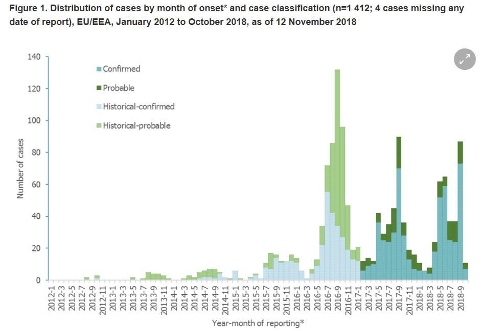 The European Centre for Disease Prevention and Control (ECDC) said most cases were reported during the summer months and due to reporting delays, additional infections are expected with onset in recent months.