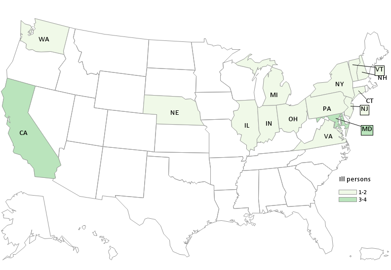 Nine people were hospitalized, including two people who developed hemolytic uremic syndrome, a type of kidney failure. One death was reported from California.