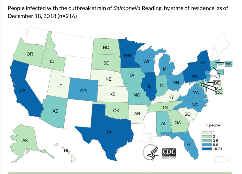 - As of Dec. 18, there have been 216 people from 38 states and the District of Columbia confirmed with infections from the outbreak strain of Salmonella Reading.