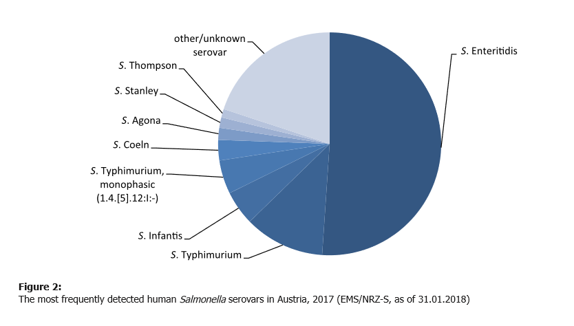 Last year, 1,672 lab-confirmed Salmonella cases were reported to the Epidemiological Reporting System (EMS) in Austria. Salmonellosis cases increased in 2017 and this could mainly be attributed to an increase in cases of serovar Salmonella Enteritidis.