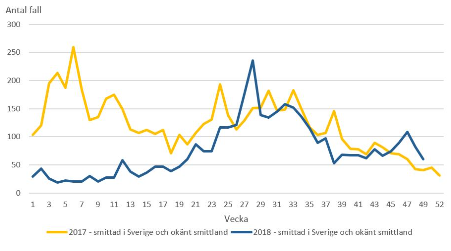 Number of cases of Campylobacter infection per week, infected in Sweden or unknown country, 2017 and 2018 (including week 49). Click to enlarge
