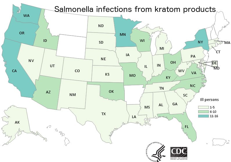 In 2018, at least 199 people in 41 states were infected with Salmonella from kratom projects with names like “Powerful Red Vein Ball” and “Super Green Maeng Da.” The outbreak saw at least 50 people admitted to hospitals. No deaths were recorded. The kratom-linked outbreak included infections from several types of Salmonella — Salmonella I 4,[5],12:b:-, Salmonella Heidelberg, Salmonella Javiana, Salmonella Okatie, Salmonella Weltevreden, and Salmonella Thompson.