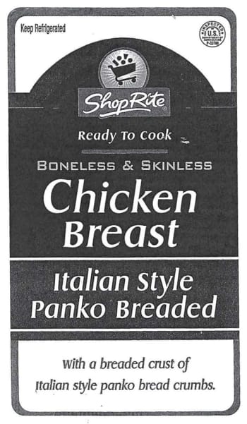 - 16-oz. plastic trays of “Shop Rite Ready To Cook BONELESS & SKINLESS Chicken Breast Italian Style Panko Breaded.”