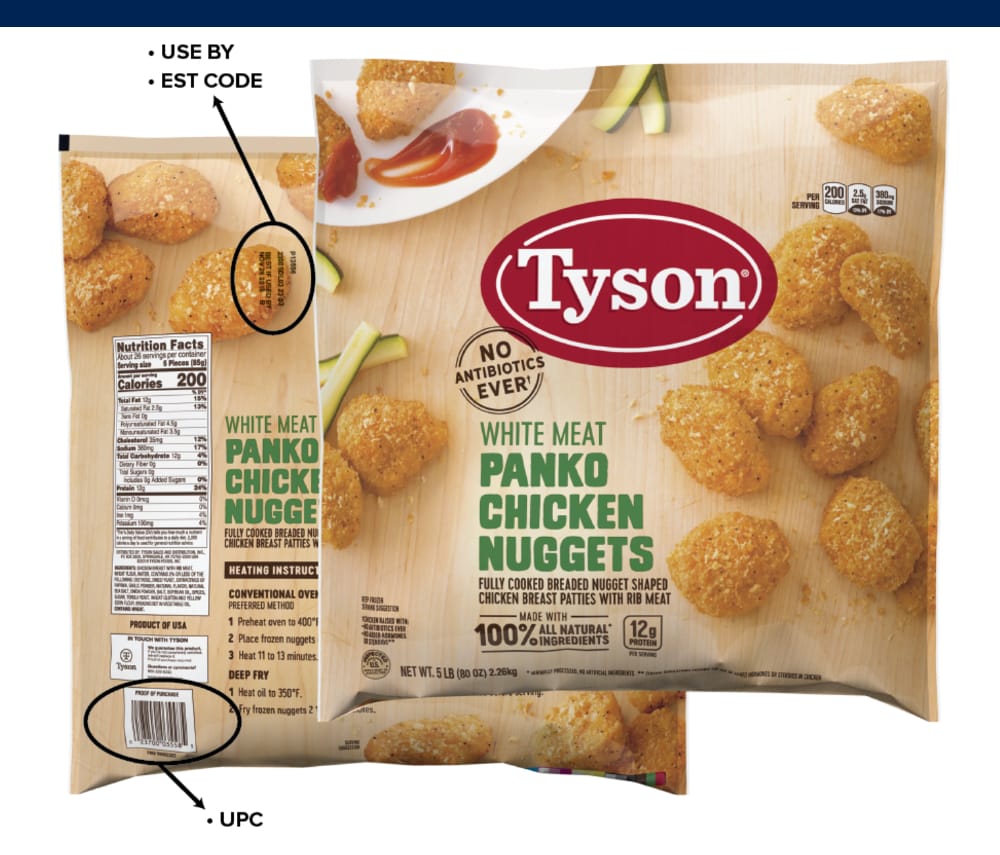 - 5-lb. plastic packages of “Tyson WHITE MEAT PANKO CHICKEN NUGGETS”