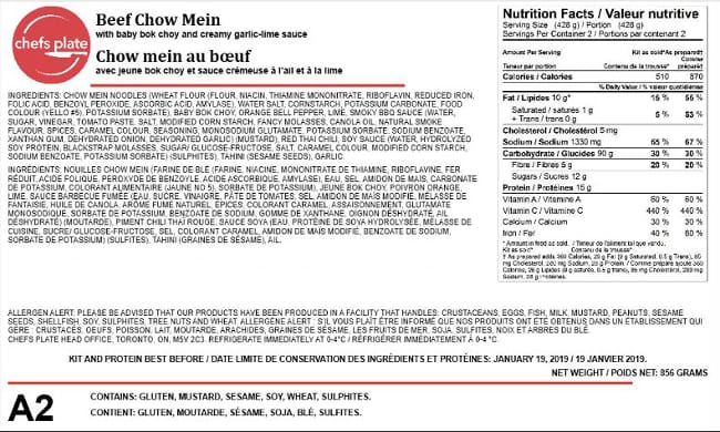 | Chefs Plate | Red chili | 1 (included in the 1712 g kit) | Included in Chefs Plate brand Beef Chow Mein meal kit coded as January 19, 2019 (A4) | None |