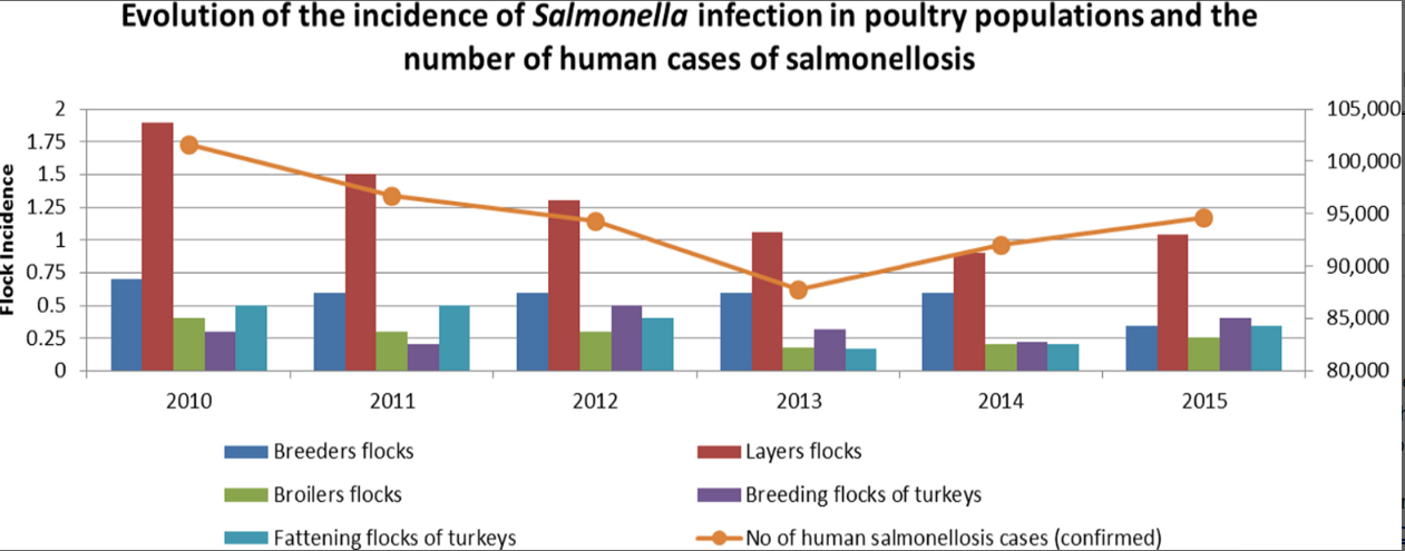 European Union countries are required to reduce the proportion of laying flocks infected with certain types of Salmonella to 2 percent. EFSA experts estimate that if this target was 1 percent with the same testing and trade restrictions that salmonellosis cases in humans transmitted via laying hens would drop by 50 percent.