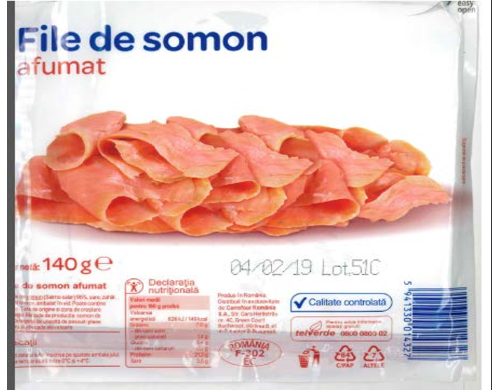 Ocean Fish “File de somon afumat Kids 50g” and ‘Somon Afumat Blueshark” with the same dates and codes as above were also recalled from Carrefour.