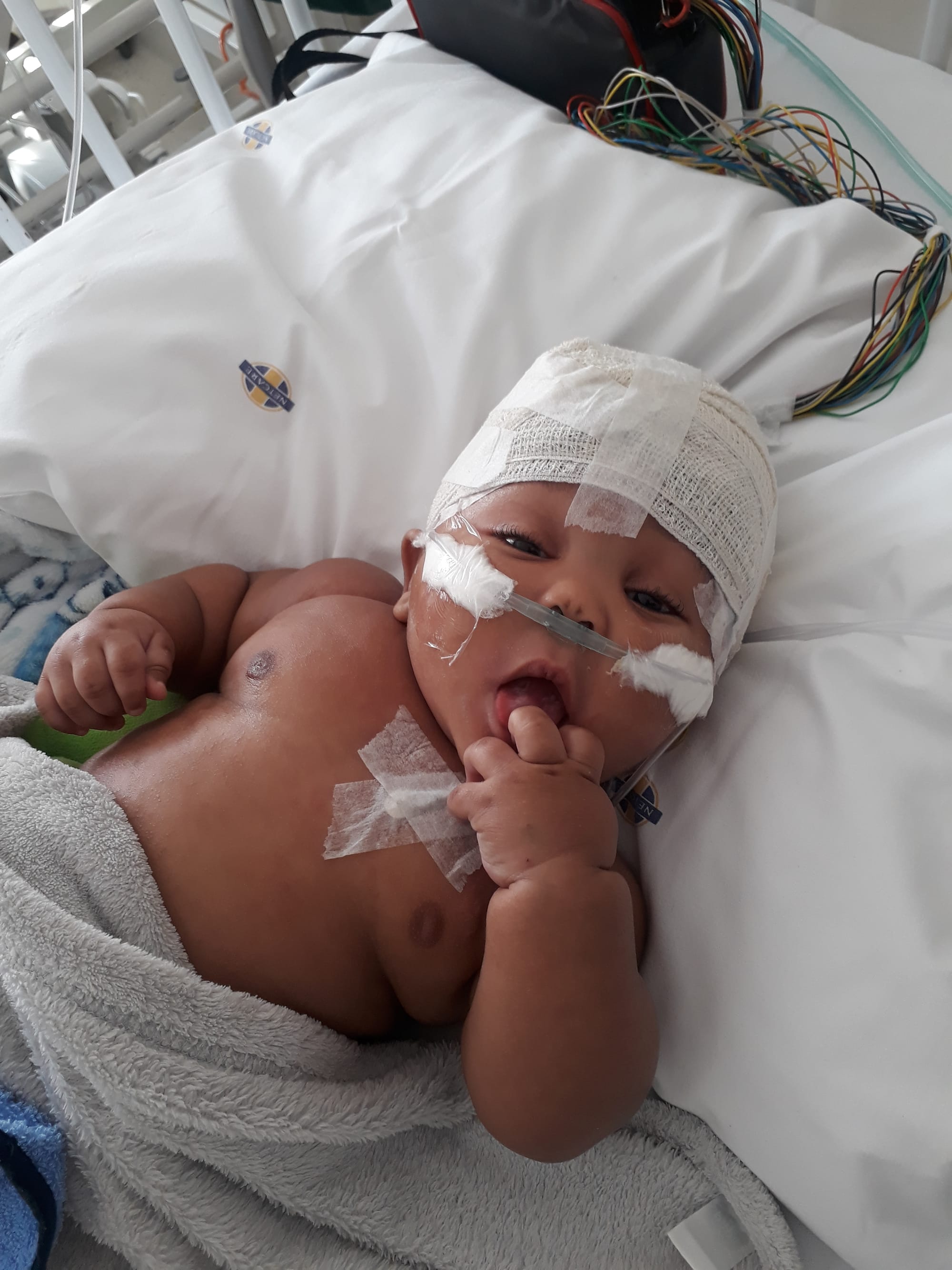 Onkarabile Olerato Mathole was expected in December 2017 but ended up being born in October. He was treated for 44 days at Akasia Hospital in Pretoria, South Africa. Onkarabile was diagnosed with hydrocephalus and has a Ventriculoperitoneal (VP) shunt in his brain to drain water. At almost 15 months old, he is struggling to crawl or walk.
