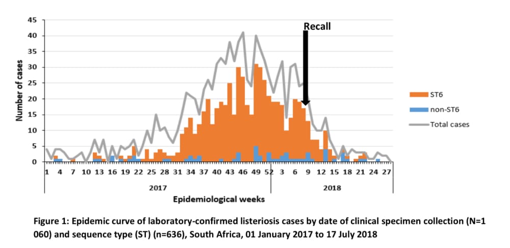 Following the declaration of the Listeria outbreak in December 2017, a multi-sectoral outbreak response was initiated. Findings were shared by the Minister of Health, Dr. Aaron Motsoaledi at a public media briefing on March 4, 2018, (statement available at www.nicd.ac.za), and are summarized below. In addition, the National Department of Health requested a full recall of implicated processed meat products. According to Dr. Aaron Motsoaledi: