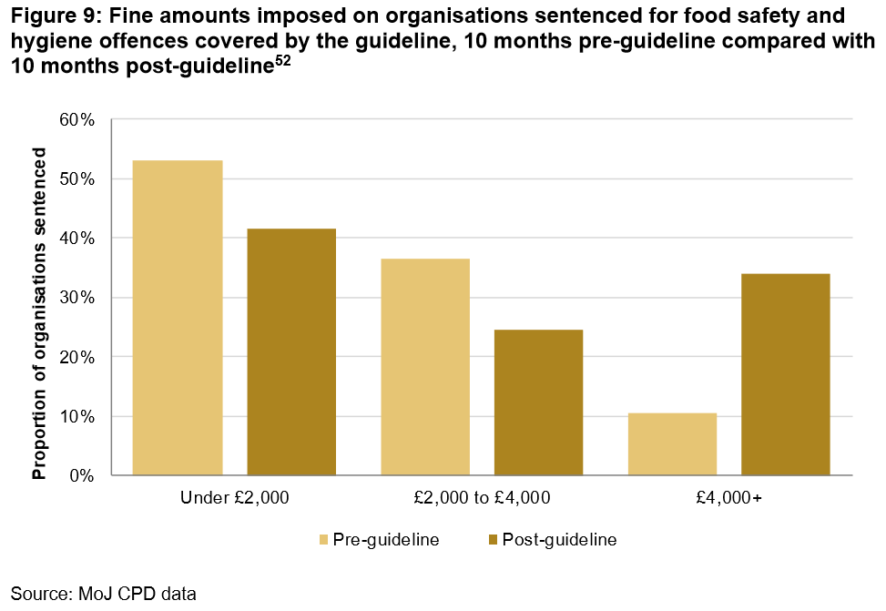 An impact assessment of guidelines by the Sentencing Council also showed there was an unanticipated small rise in fines for individuals sentenced for food safety and hygiene offenses. The increase in fines was not as large as that for health and safety violations.