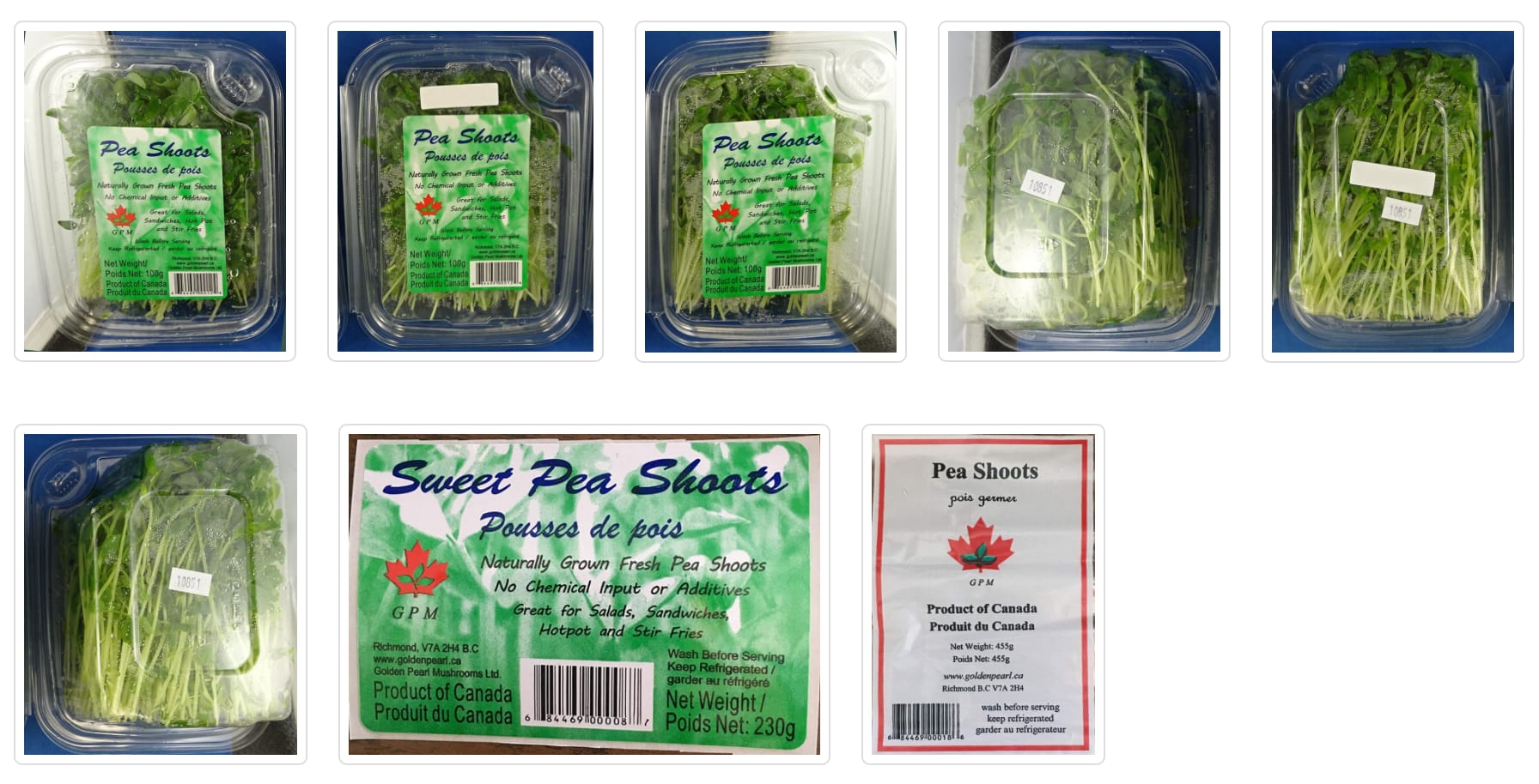 Golden Pearl Mushrooms distributed the raw pea shoots to retailers in the provinces of Alberta and British Columbia.