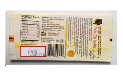 The recalled 3-ounce “Sea Salt 70% Dark Chocolate” bars feature lot code 3092529 with a “Best-By date” of “1/2020.” Consumers can find the lot code and Best-By date on the back side of the bar’s packaging.