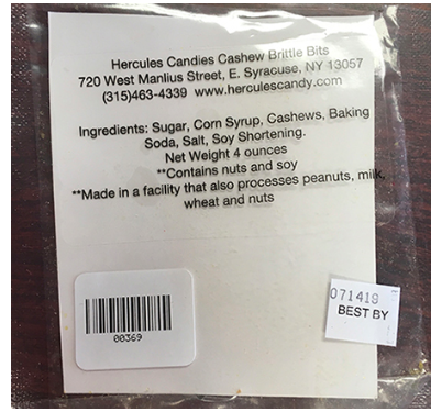 The recalled “Cashew Brittle Bits” were packaged in 4-ounce, clear plastic packages and are marked with a “Best By” date of “7/14/19”, and a barcode number of “00369.” Consumers can look on the back of the package for the above label information. According to the recall notice, “there are no UPC codes.”