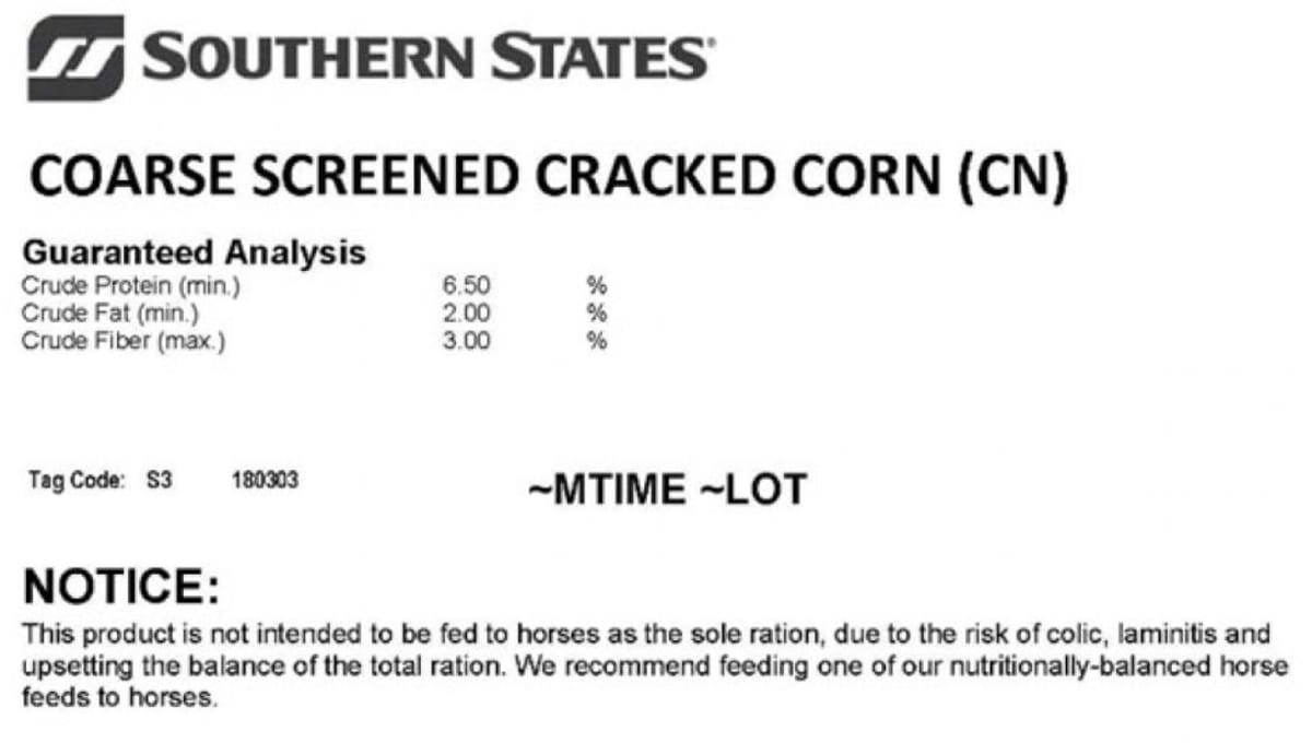| Southern States Coarse Screened Cracked Corn (CN) | 50 lb | N9045 | 591180 | All Stock | Feb 2019 | 90 days |
