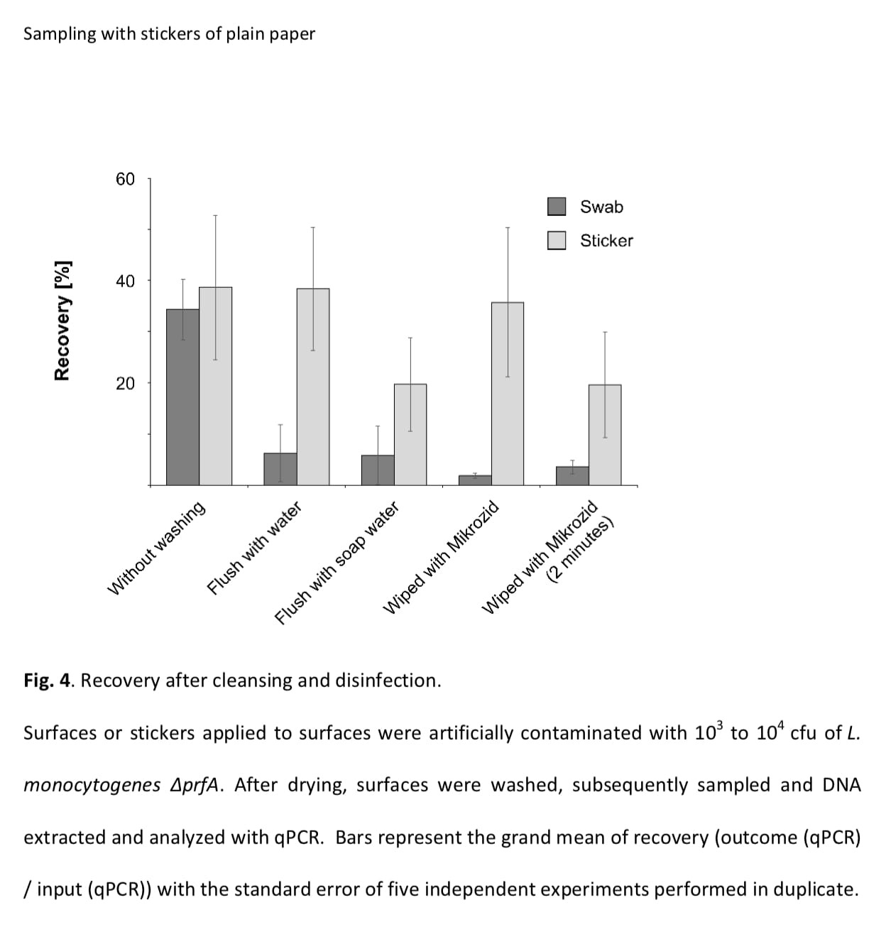 Food processing plant surfaces must be cleaned regularly, and unlike swabs, artificially contaminated stickers were able to provide a record of contamination that took place over at least two weeks, despite washing, flushing with water, or wiping with the alcohol-based disinfectant Mikrozid to simulate cleansing practices.
