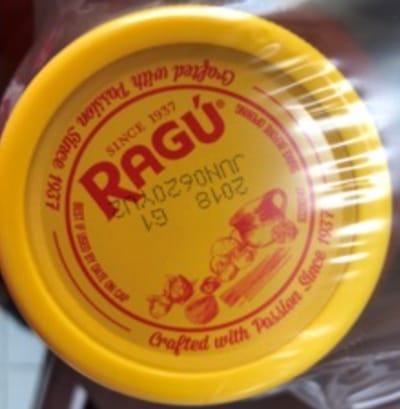 This is just one of the five recalled Ragu pasta sauces. All five have identifying codes stamped on the lid. RAGÚ Chunky Tomato Garlic & Onion in 45-ounce jars with the cap code JUN0620YU2 and a best-by date of JUN0620YU2
