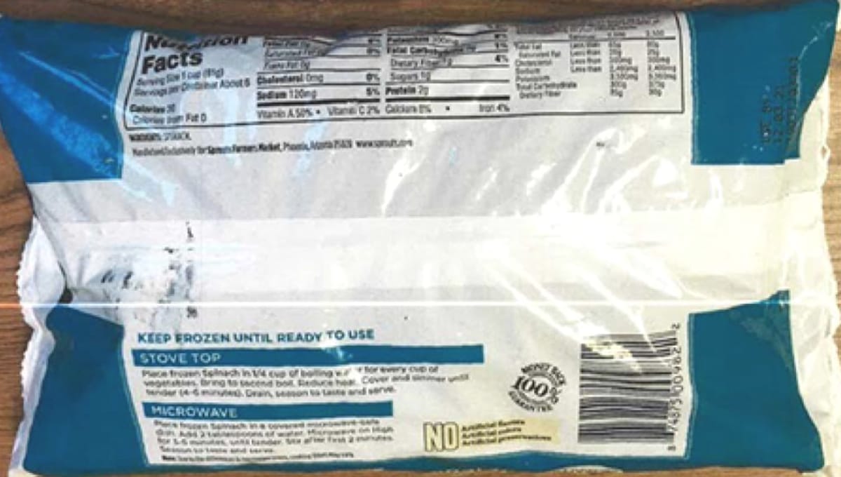 Sprouts provided this photo to the FDA along with it’s recall notice. The date code is in the upper right corner on the back of this bag of frozen spinach. Click to enlarge. “Sprouts Frozen Cut Leaf Spinach” in 16-ounce plastic bags