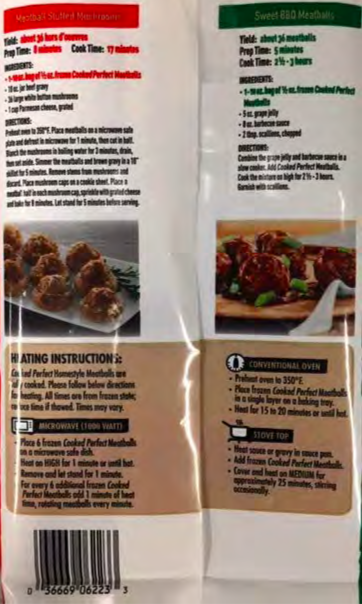 - 48-oz. plastic bag packages of “COOKED PERFECT BRAND HOMESTYLE MEATBALLS All Natural” and Best If Used By “07/02/20.”