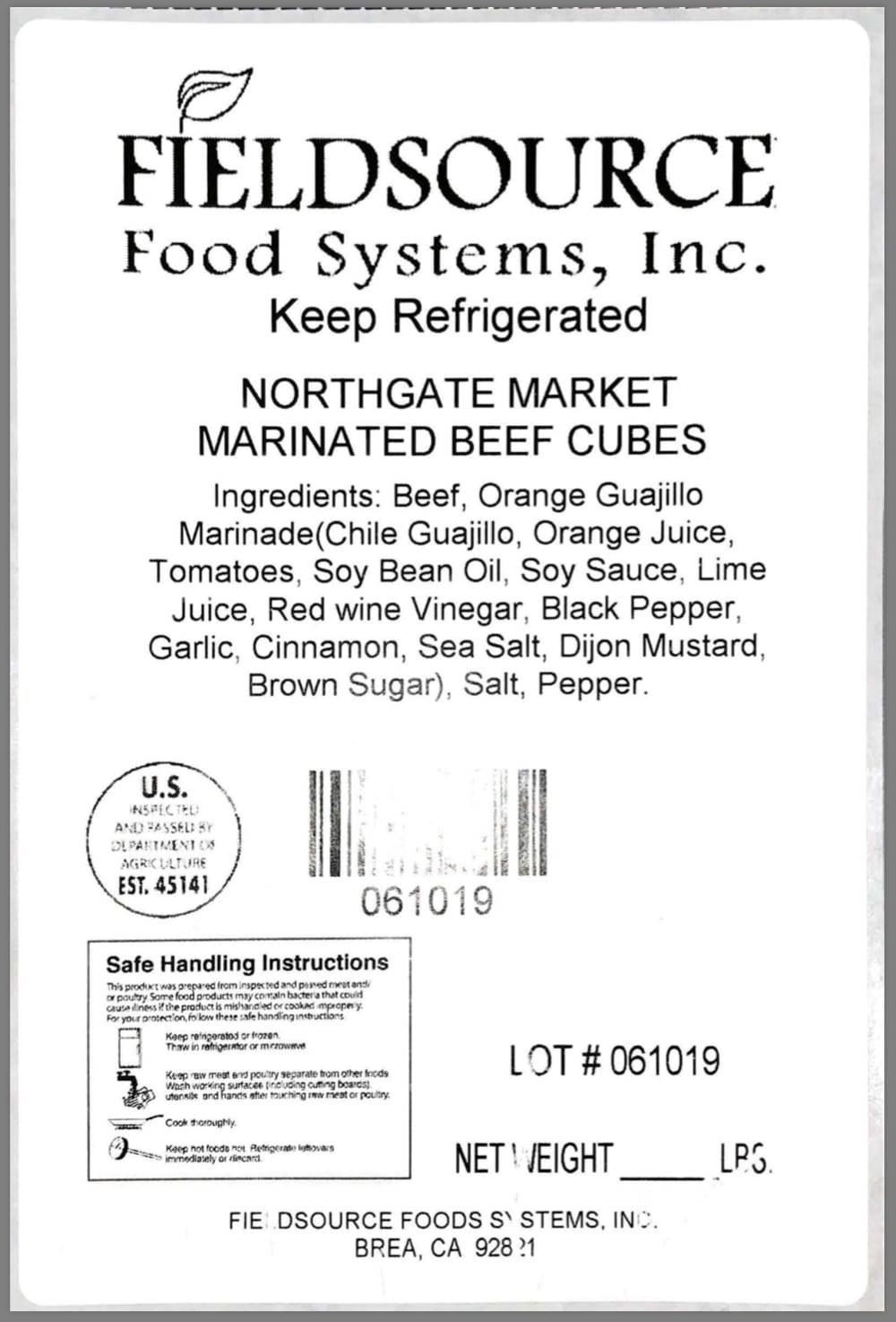 - 20-pound boxes containing four unmarked 5-pound plastic bags with “FIELDSOURCE Food Systems, Inc. NORTHGATE MARKET MARINATED BEEF CUBES” with any lot codes between 061019 through 071019 inclusive, that are printed on the label.