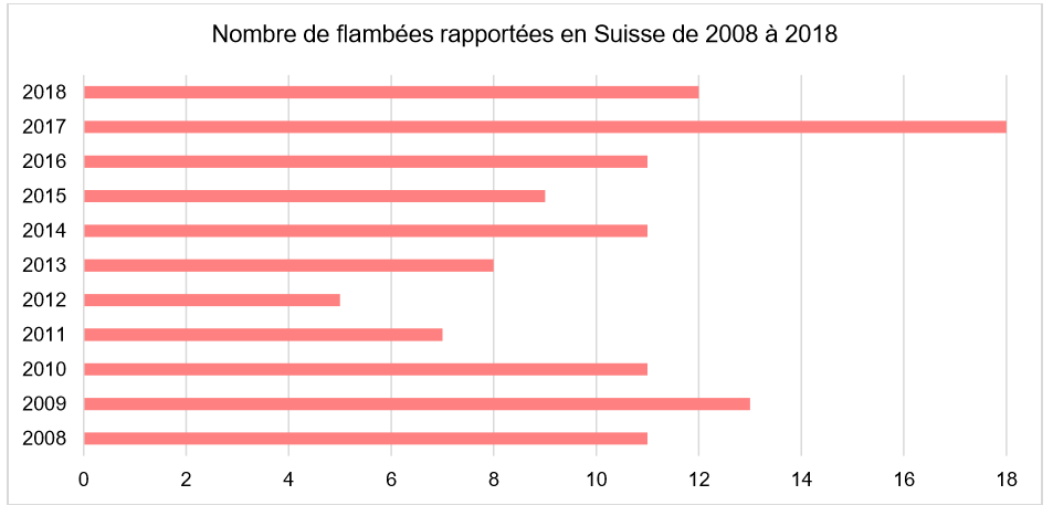 Foodborne outbreaks have been rare in Switzerland for several years. Only 12 were reported for 2018 compared to 18 the previous year. In these dozen incidents, more than 153 people became ill and at least five were hospitalized. In seven cases it was not possible to identify the infectious agent. In the largest outbreak, 73 soldiers belonging to a military school fell ill in one night with gastrointestinal pain and sometimes diarrhea and vomiting but an investigation did not identify the agent or source.