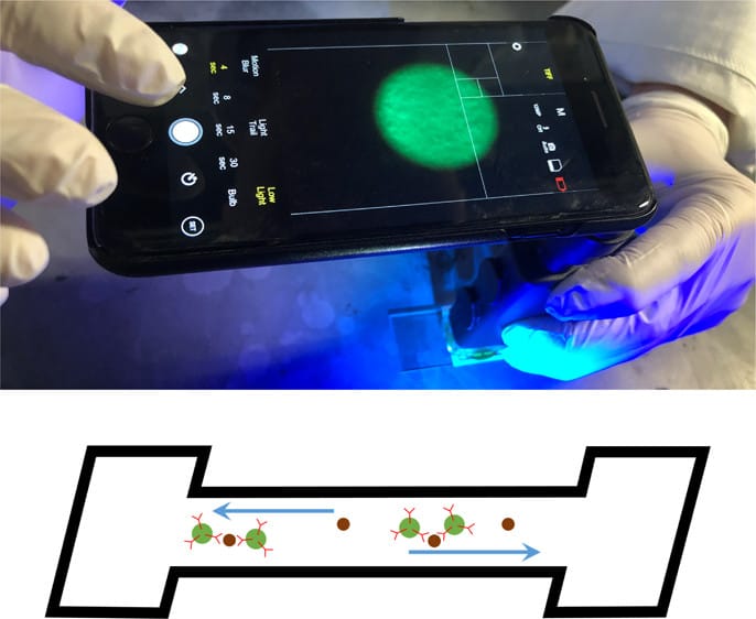 In previous work, the team developed a smartphone-based device that could detect low levels of norovirus by measuring the light scattered from virus-bound polystyrene beads in a paper microfluidic chip.