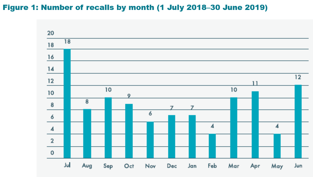 The food safety team at Food Standards Australia New Zealand (FSANZ) coordinated 106 incidents and recalls from July 2018 to June 2019, which was the highest number of recalls in a 12 month period. This compares to 81 recalls in the same period from 2017 to 2018 and 61 from 2016 to 2017.