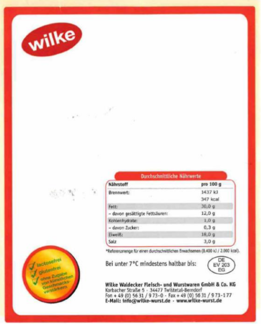 Products made by Wilke have been recalled. German authorities are updating a document with affected products that is now 13 pages long. They can be recognized by the oval identification mark “DE EV 203 EG”, which identifies the manufacturer regardless of the brand. Items could have been sold loose and to hospital kitchens and canteens.