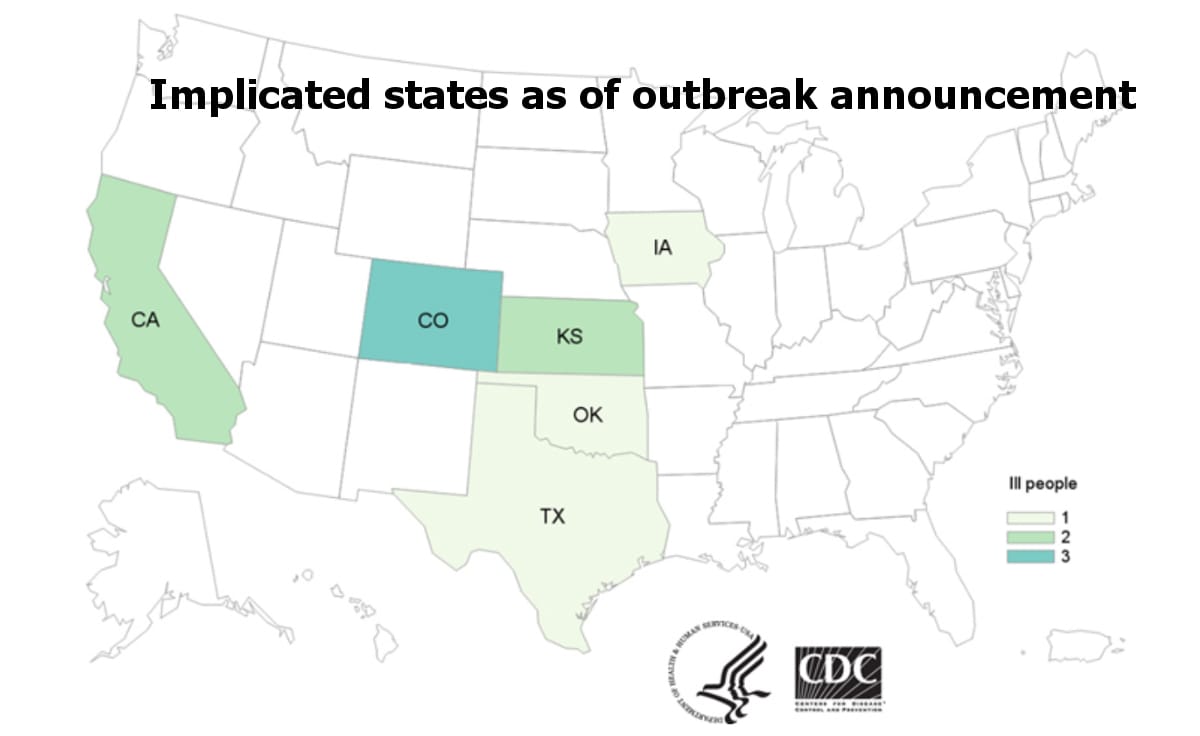 The CDC reported the following states with lab-confirmed patients as of today: California with 2, including the patient who died; Colorado 3; Iowa 1; Kansas 2; Oklahoma 1; and Texas 1.