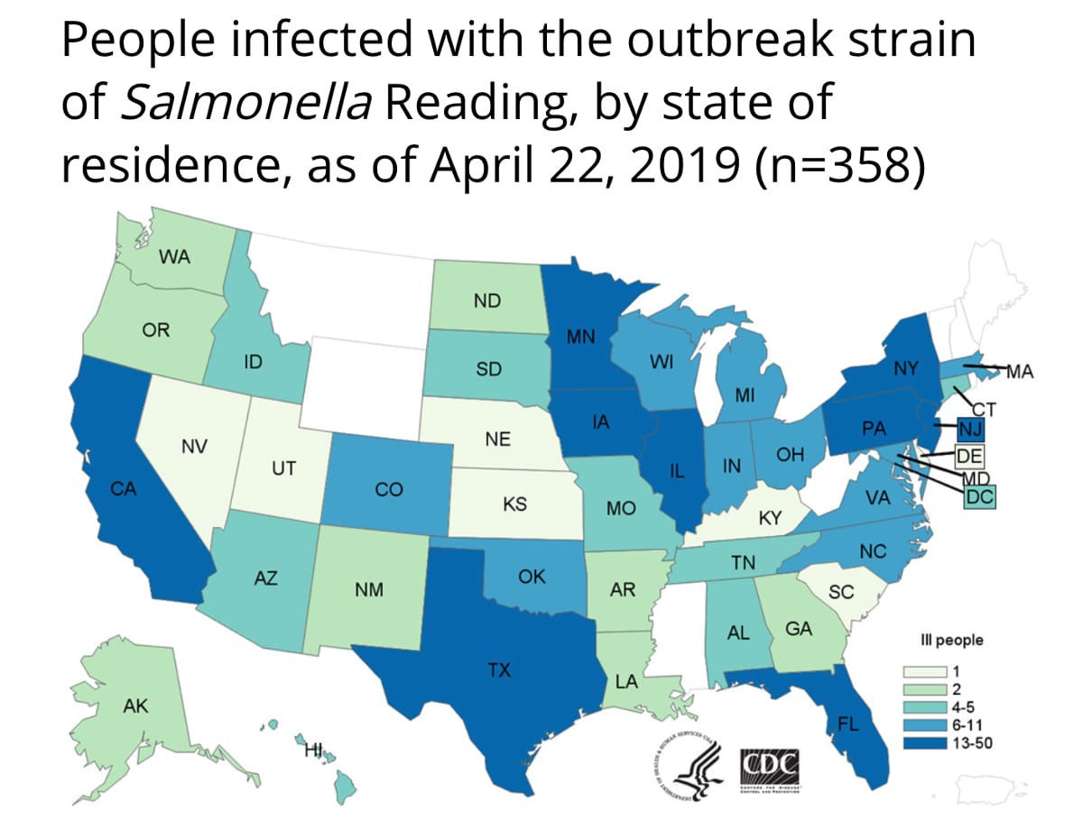 Of the 126 confirmed patients in Canada and the 358 in the United States, one died in each country. Hospitalization rates have been higher than usual for Salmonella infections, with 38 in Canada and 133 in the United States having been admitted for in-patient care.