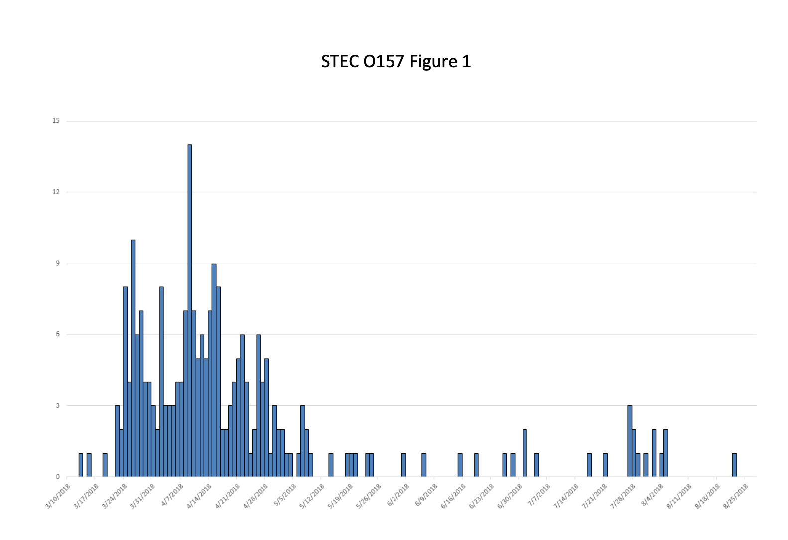 A case was defined as an infection between March 13 and August 22, 2018 with one of the 22 identified outbreak-associated E. coli O157:H7 or E. coli O61 pulsed-field gel electrophoresis pattern combinations, or with a strain STEC O157 that was closely related to the main outbreak strain by whole genome sequencing.