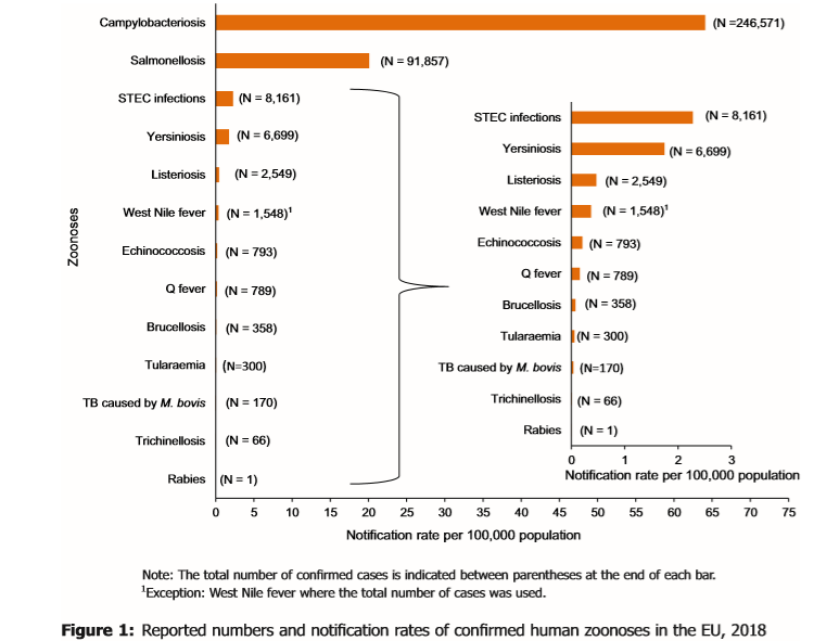 The most commonly reported zoonoses were campylobacteriosis and salmonellosis. The EU trend for confirmed cases of these two diseases was stable during 2014 to 2018. Last year campylobacteriosis was top, as it has been since 2005, representing almost 70 percent of cases.