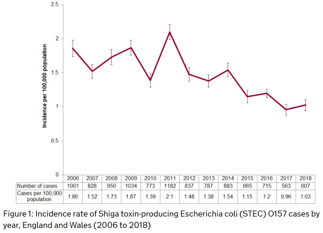 The number of STEC O157 cases in England increased in 2018, but remained below pre-2015 levels. A reason for the decline in recent years is unclear, according to PHE.